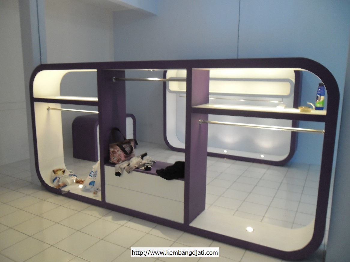 Commercial Furniture : Pesanan dari Ibu Ida – Kendal, yaitu display showcase untuk fashion / pakaian, tema lengkung (yang sedang trend / digemari) dan sekat ruang dari gypsum. Warna pilihan ungu. Terima kasih untuk ibu Ida, semoga selalu sukses.